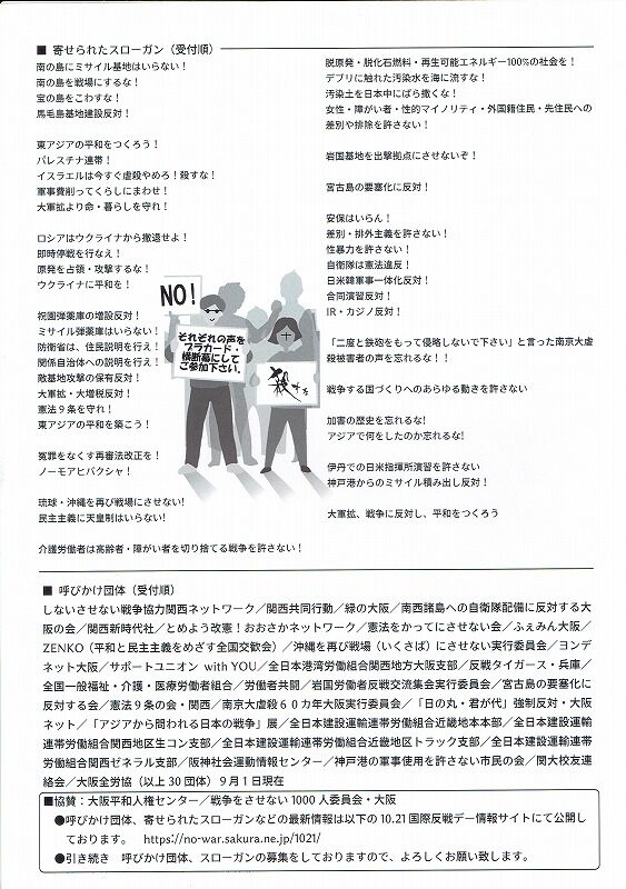 しないさせない戦争協力関西ネットワーク/関西共同行動/緑の大阪/南西諸島への自衛隊配備に反対する大阪の会/関西新時代社/とめよう改憲!おおさかネットワーク/憲法をかってにさせない会/ふぇみん大阪/ZENKO(平和と民主主義をめざす全国交歓会)/沖縄を再び戦場(いくさば)にさせない実行委員会/ヨンデネット大阪/サポートユニオンwith YOU/全日本港湾労働組合関西地方大阪支部/反戦タイガース・兵庫/全国一般福祉・介護・医療労働者組合/労働者共闘/岩国労働者反戦交流集会実行委員会/宮古島の要塞化に反対する会/憲法9条の会・関西/南京大虐殺60カ年大阪実行委員会/「日の丸・君が代」強制反対・大阪ネット/「アジアから問われる日本の戦争」展/全日本建設運輸連帯労働組合近畿地方本部/全日本建設運輸連帯労働組合関西地区生コン支部/全日本建設運輸連帯労働組合近畿地区トラック支部/全日本建設運輸連帯労働組合関西ゼネラル支部/阪神社会運動情報センター/神戸港の軍事使用を許さない市民の会/関大校友連絡会/大阪全労協(以上30団体)9月1日現在