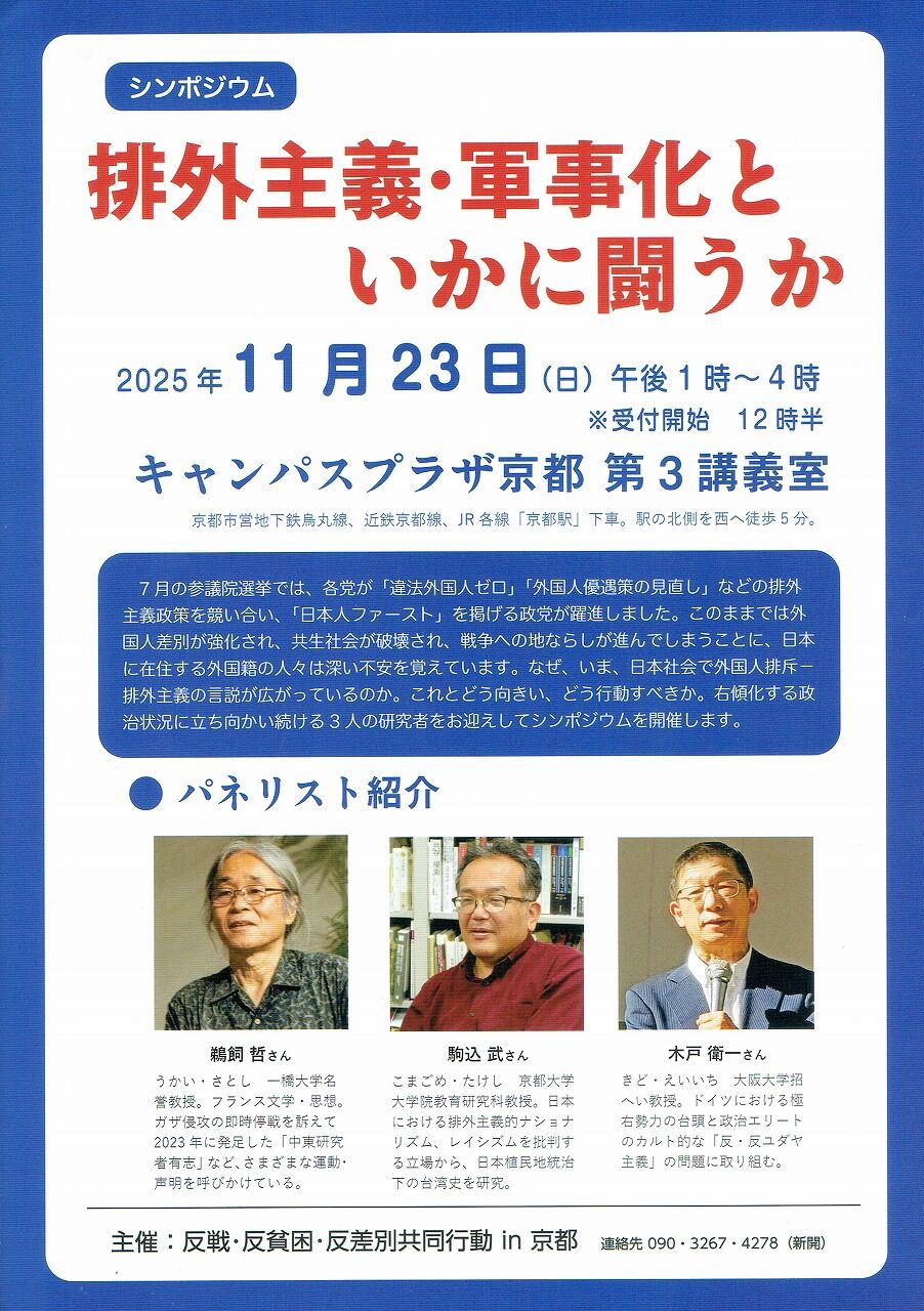 7月の参議院選挙では、各党が「違法外国人ゼロ」「外国人優遇策の見直し」などの排外主義政策を競い合い、「日本人ファースト」を掲げる政党が躍進しました。このままでは外国人差別が強化され、共生社会が破壊され、戦争への地ならしが進んでしまうことに、日本に在住する外国籍の人々は深い不安を覚えています。なぜ、いま、日本社会で外国人排斥ー排外主義の言説が広がっているのか。これとどう向き合い、どう行動すべきか。右傾化する政治状況に立ち向かい続ける3人の研究者をお迎えしてシンポジウムを開催します。