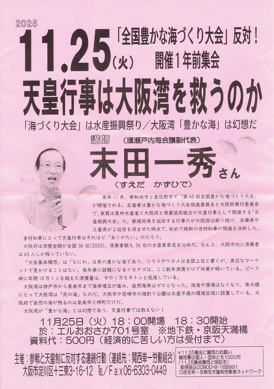 来年11月、岸和田市と泉佐野市で「第45回全国豊かな海づくり大会」が開催される。主催者は豊かな海づくり大会推進会と大阪府実行委員会で、実質は農林水産省と大阪府と漁業協同組合が天皇行事として開催する「水産振興大会」だ。都道府県を巡回する行事だが大阪府は断り続け、兵庫県や三重県が2巡目を済ませた時点で、初めて維新の吉村知事が開催を決断した。
