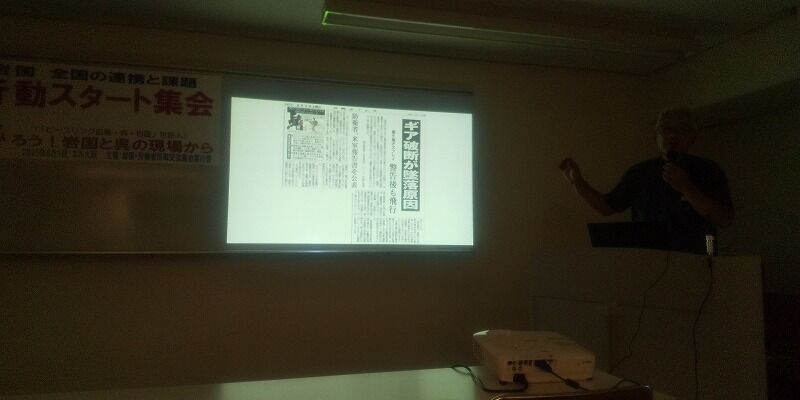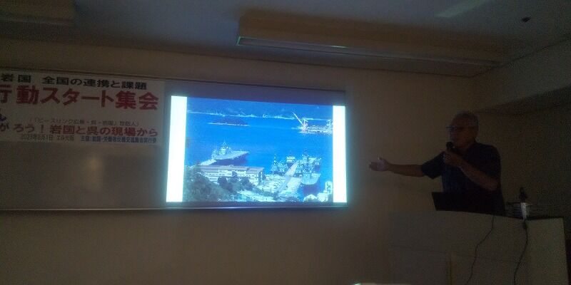 暑い中、14時に集会開始。司会あいさつの後、全港湾建設支部で、辺野古現地での闘いをささえている宮崎史朗さんの講演がはじまる。