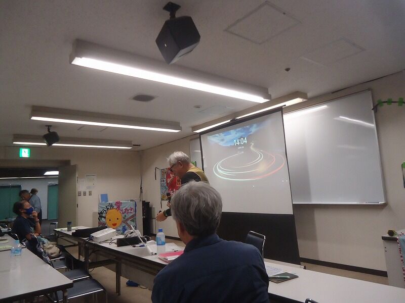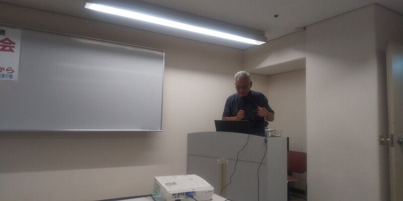 続いて「辺野古ぶるーHYOGO」から、海上行動に参加している小野純一さんから「海上行動の今」という題で講演。海上行動もさることながら、名護市内でであった普通の人が、辺野古新基地建設問題について「あきらめている」ような会話をしたことを話され、彼らをそういった状況に追い詰めているのは誰か?という鋭い問いかけをなされた。