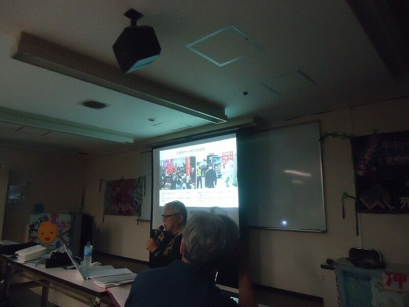 続いて、辺野古新基地建設現場の空撮写真や、平面図を示して工事の進行状況の説明があった。そして、ゲート前で工事用車両を止めている写真が紹介される。