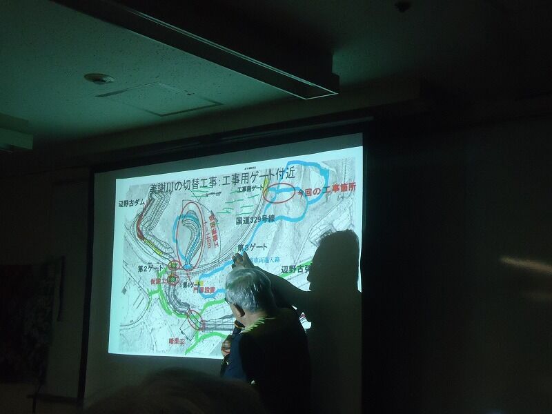 次に、美謝川の切替工事を含めた、敷地内の造成工事について図面を使って説明。敷地内に米軍のゲートがあって、そこで検問があるため、工事用車両が長々と滞留する…敷地内(阻止行動をやっている工事用ゲートの内側)に仮設道路をつくって、そこが車両の待機場所となっているそうだ。なんか米軍が工事の”妨害”をしているようにも見受けられる。