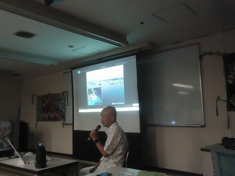 まずはじめに、先日投開票が行われた参議院選挙の報告。「オール沖縄」が推す高良さちかさんの当選を報じる新聞記事などが報告された。写っているスライドは、6月初旬の辺野古大行動でのもの。高良さんも参加されている。