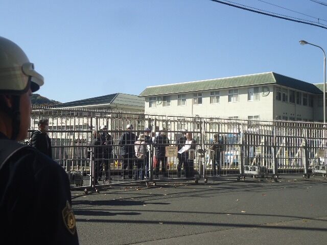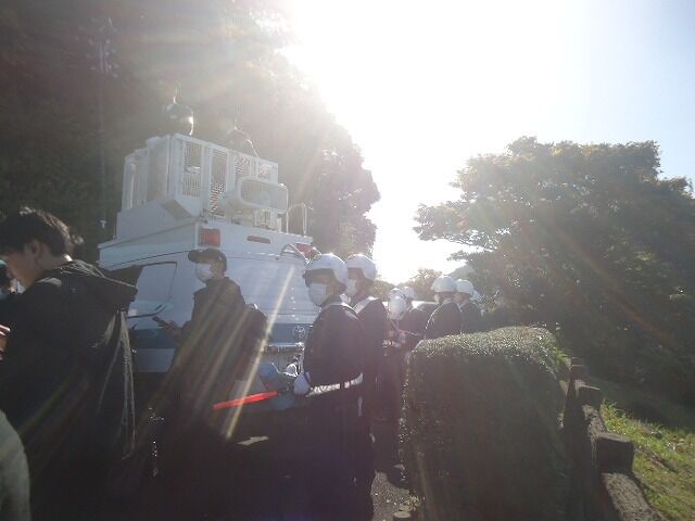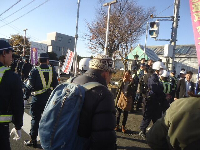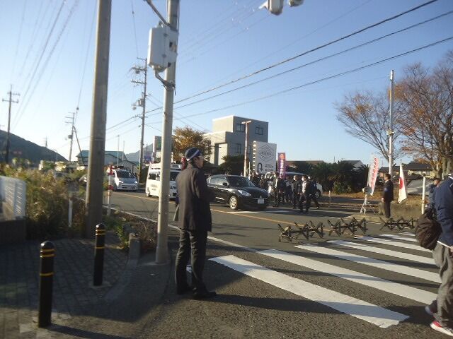 また国道との交差点で、クソ右翼が警察の規制線内でわめいている。