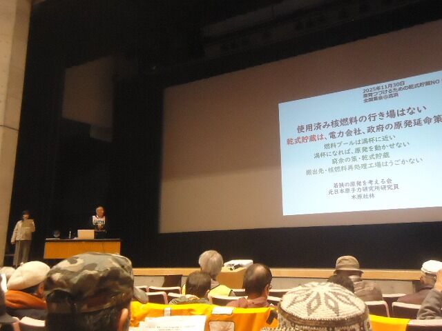 13時から集会開始。司会あいさつの後、若狭の原発を考える会・木原壯林さんが「使用済み核燃料の行き場はない」と題する講演。