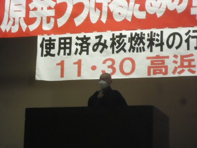 講演の後、老朽原発うごかすな!実行委員会の中嶌哲演さんの、主催者あいさつ(本当は主催者あいさつが先なのだが、渋滞で遅れたとのこと)