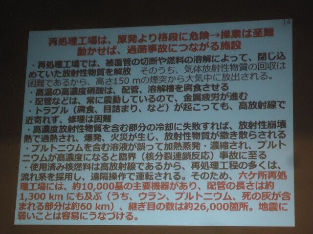 再処理工場は、原発よりさらに危険…使用済燃料を高温・高濃度の硝酸で溶かすのだが、それが廃刊や溶解槽を腐食させる。廃刊は常に振動しているので、金属疲労が進む、トラブルが起こっても、高放射線で近寄れず、修理は困難…などなど。