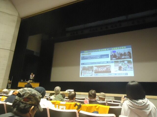 申し入れ終了後、コールをしてからバスに乗り、高浜町文化会館へ。