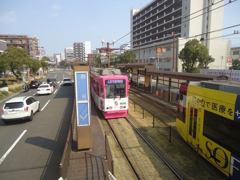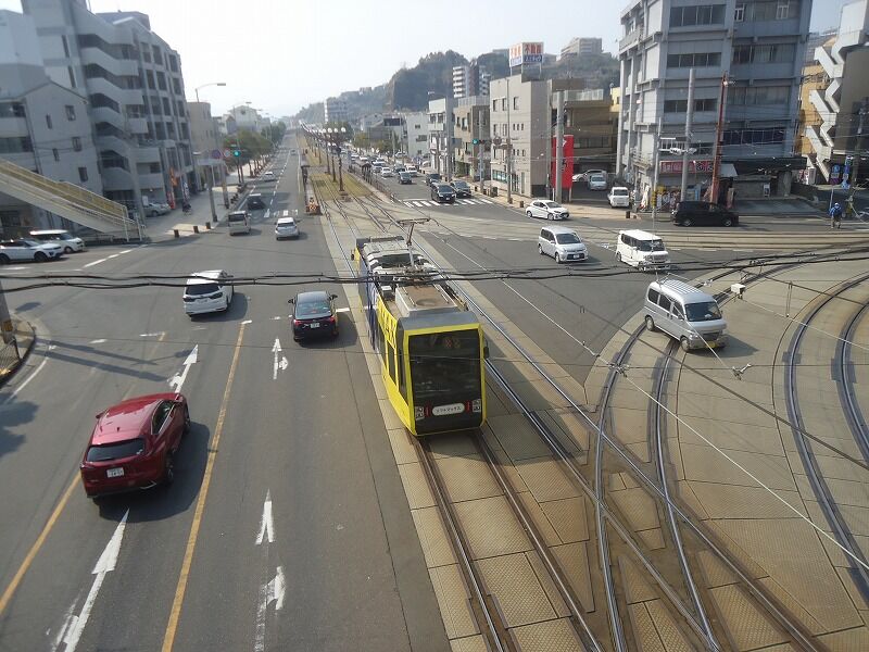 郡元に戻って、電停につながる歩道橋に上って撮影。なお架線もセンターポール化されており、すっきりしている。