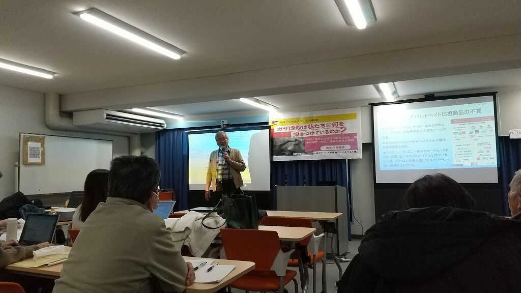 含まれている。また日本の年金の対イスラエル投資中止、イスラエル国債を約2270億円、パレスチナ人虐殺に加担していると国連が認定した企業の株式約8740億円分を保有している現状がある。そして、アパルトヘイト加担商品の不買、イスラエル産ワインやソーダストリーム、REEBORK BOOKING.COM ディズニーなど…ここでボイコット対象のリストはないのか?という質問がよく来るが、私たちが「買わなければよい」というような品物は減ってきており、かつてはフルーツにイスラエル産が多かったが最近は減ってきている。イスラエル自体「ものづくり」のシェアが減ってきており、工業・農業製品よりソフトウエアなどの比率が高まっているそうだ。
