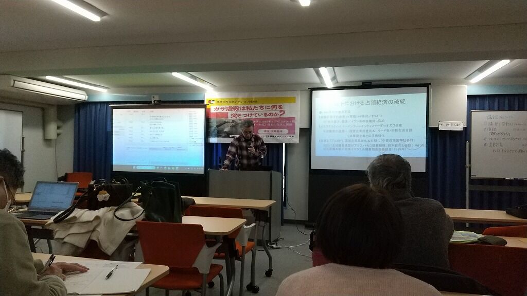 1月18日日曜日、PLP会館4階中会議室で、関西ガザ緊急アクションが企画する講演集会「ガザ虐殺は私たちに何を突きつけているのか?」に参加してきた。講師は、同支社大学人文科学研究所嘱託研究員の役重善洋さんである。
