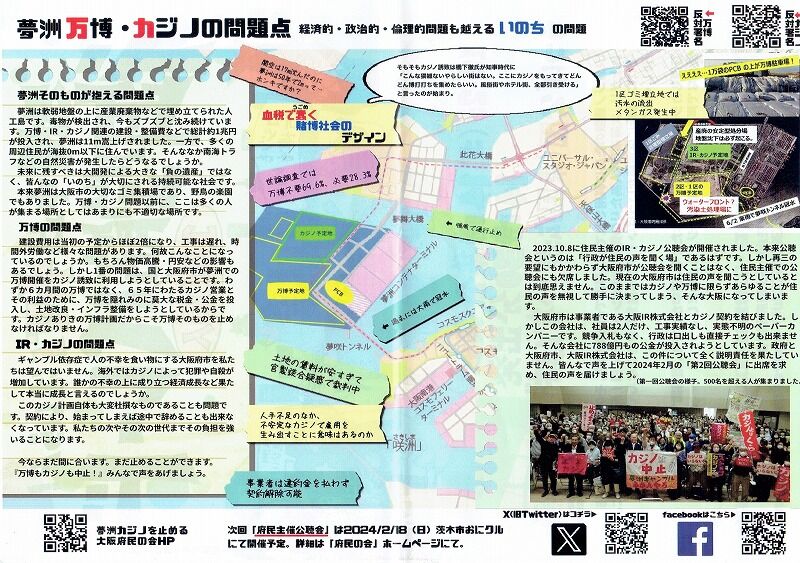 大阪府市は事業者である大阪IR株式会社とカジノ契約を結びました。しかしこの会社は、社員は2人だけ、工事実績なし、実態不明のぺーパーカンパニーです。競争入札もなく、行政は口出しも直接チェックも出来ません。そんな会社に788億円もの公金が投入されようとしています。政府と大阪府市、大阪IR株式会社は、この件について全く説明責任を果たしていません。皆んあで声を上げて2024年2月の「第2回公聴会」に出席を求め、住民の声を届けましょう。