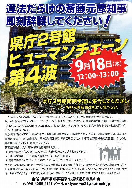 その他、兵庫県警は、優勝パレード協賛金と県補助金を巡る問題(背任罪)で、斎藤知事と片山保孝元福知事を6月13日に書類送検しています。違法だらけの斎藤知事は、もうこれ以上、知事の座にとどまることはできません。逮捕・起訴される前に自ら身を引くべきです。9月18日(木)、県民が大きな声を上げます。是非、あなたも加わってください!