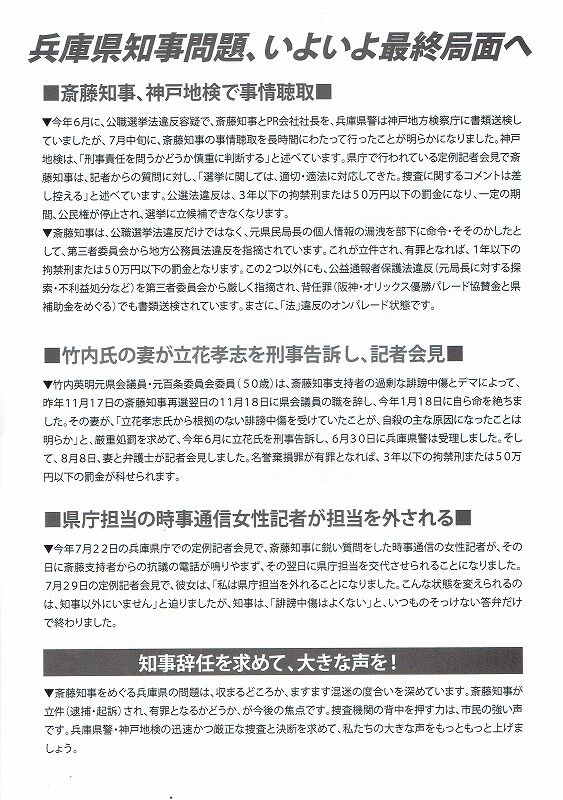 ▼斎藤知事をめぐる兵庫県の問題は、収まるどころか、ますます混迷の度合いを深めています。斎藤知事が立件(逮捕・起訴)され、有罪となるかどうか、が今後の焦点です。捜査機関の背中を押す力は、市民の強い声です。兵庫県警・神戸地検の迅速かつ厳正な捜査と決断を求めて、私たちの大きな声をもっともっと上げましょう。