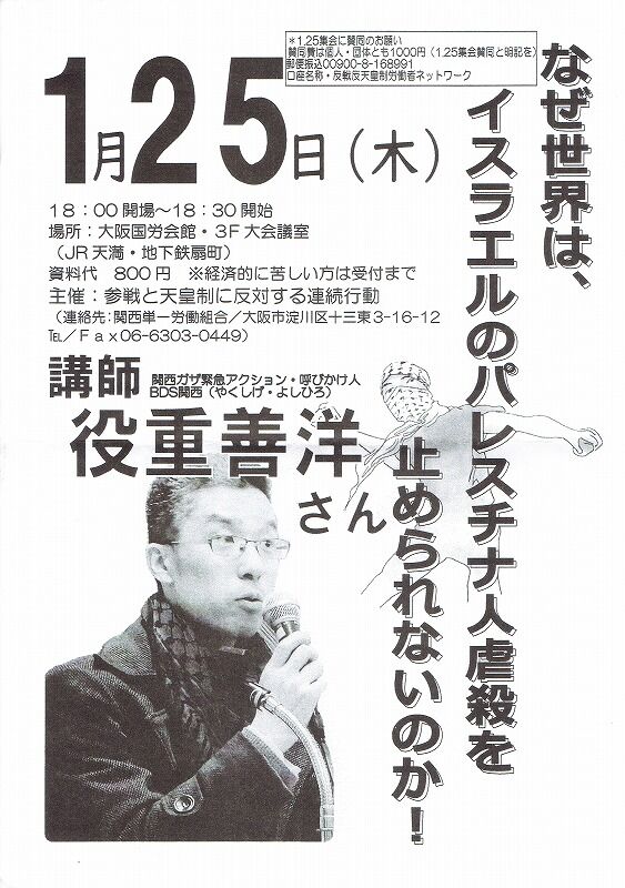 昨年、10月7日ハマース等による越境攻撃への報復として、イスラエル軍はガザ地区への激しい攻撃を続けています。パレスチナ側の死者数は100日間で24,100人を超え、そのうち子どもの死者数は10,000人を超えています。ガザ保健省は、ガザ市民の20人に1人が死傷者または行方不明者になっていると発表しています。一刻も早い人道的停戦が求められています。バイデン大統領は、昨年9月、国連総会で「国連安保理の常任理事国が隣国に軍事侵攻し、地図から主権国家を消そう」としているとロシアを激しく非難しました。一方でアメリカは、国際法や国連決議を無視してパレスチナに攻撃と入植を続けるイスラエルに対しては非難することなく一貫して支持を表明してきました。今回の無差別報復へも支持を表明しています。このようなアメリカのダブルススタンダードは決して許されるものではありません。また、日本の岸田政権もアメリカに追従してイスラエルに対して即時停戦を迫っていません。日本は、憲法九条を持つ国として平和的な解決のために積極的な役割を果たすべきです。私たち市民は、全世界の市民と連帯し、イスラエルの市民とも連帯し、一刻も早い停戦の実現とパレスチナに恒久的な平和を!の声を上げていきましょう。