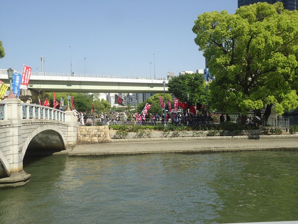 御堂筋に出て、北上する。米領事館前を通るので、その時はアメリカのイスラエル支援政策を弾劾するコールも。(個人的には、沖縄での米兵の性暴力や地位協定改定なども訴えてほしかったが…)