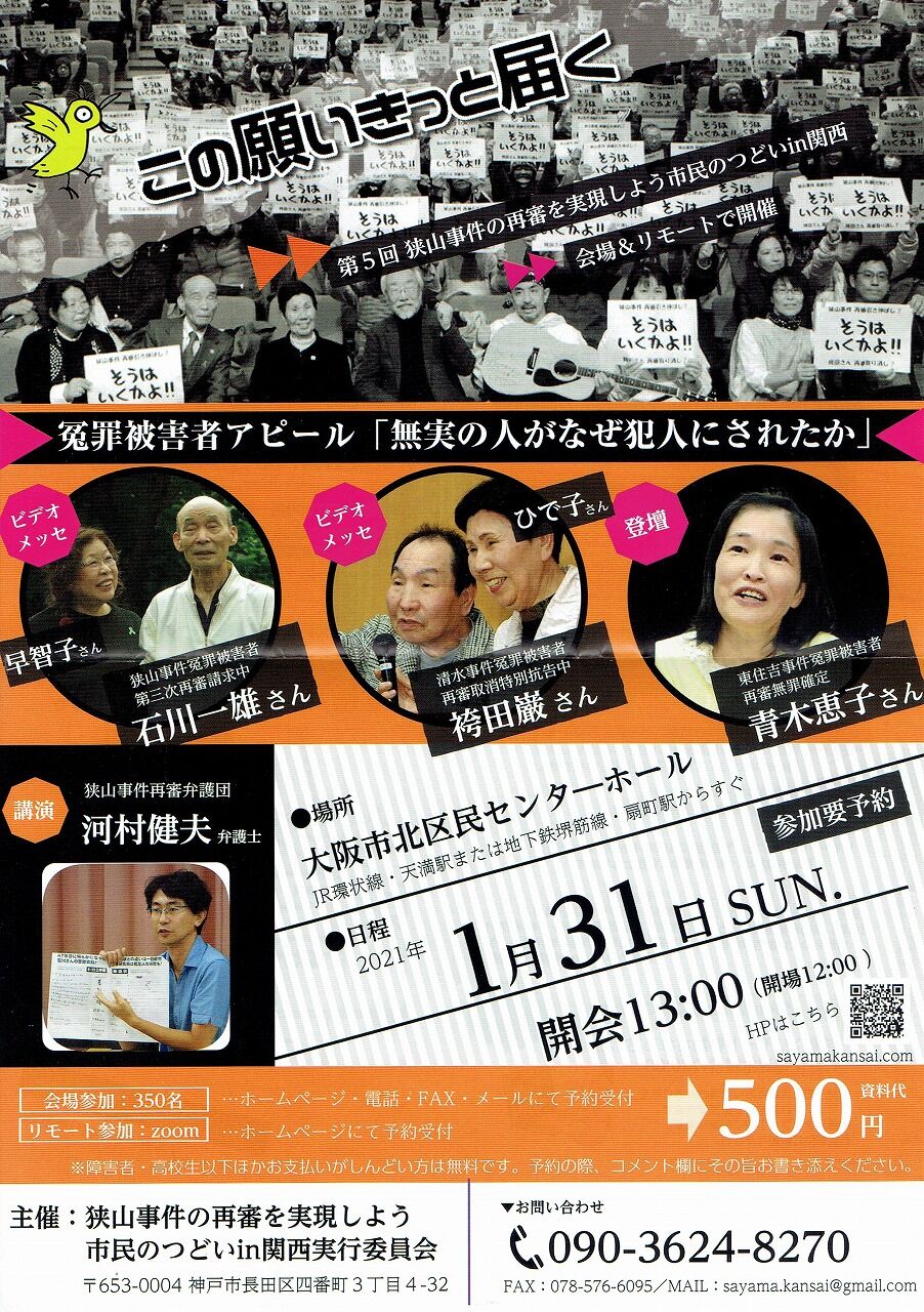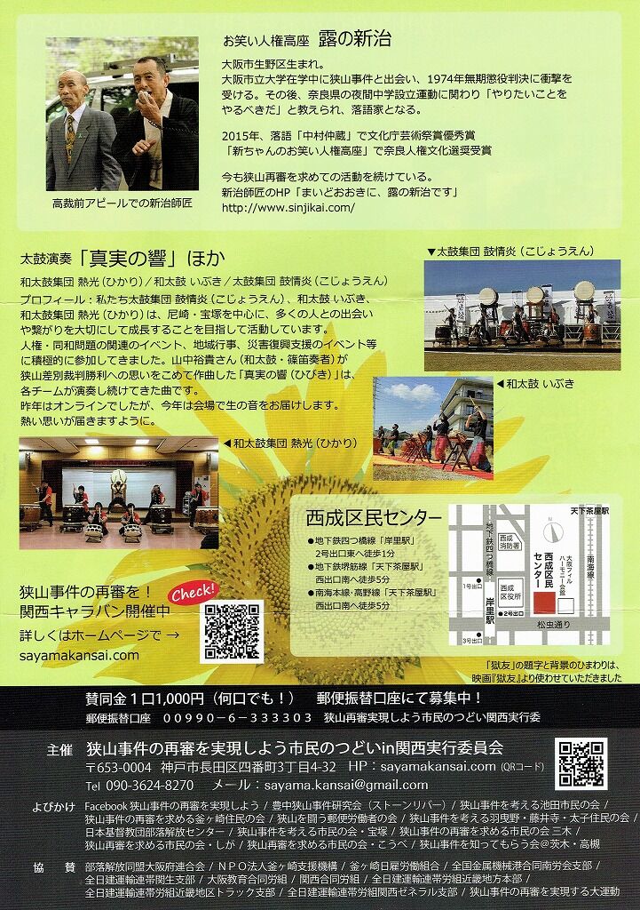 郵便振替口座 00990-6-333303 狭山再審実現しよう市民のつどい関西実行委