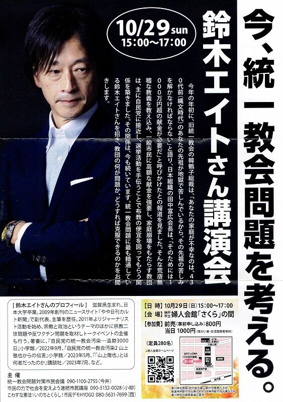 今年の年初に、旧統一教会の韓鶴子総裁は、「あなたの家庭が不幸なのは、430代前(縄文時代)のあなたの先祖が地獄で苦しんでいるから。その先祖の苦しみを解かなければならない」と語り、日本組織の田中富広会長は、「そのためには1000万円の献金が必要だ」と呼びかけたとの報道を観ました。そんな荒唐無稽な教義を教え込み、一般市民に高額な献金を強要し、家庭崩壊をもたらす教団は、主に自民党に接近し、宣教活動を手伝うことで布教の便宜を図ってもらう関係を築きました。その関係は、今も続いています。統一教会問題に最も精通している鈴木エイトさんを招き、教団の何が問題か、どうすれば克服できるのかをお聞きします。