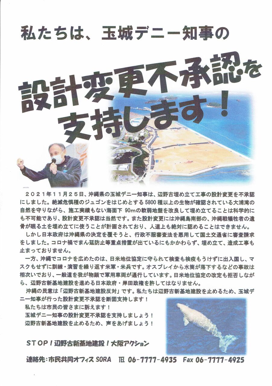 STOP!辺野古新基地建設!大阪アクションが主催する、沖縄県の設計変更不承認を支持するアクションのお知らせ…