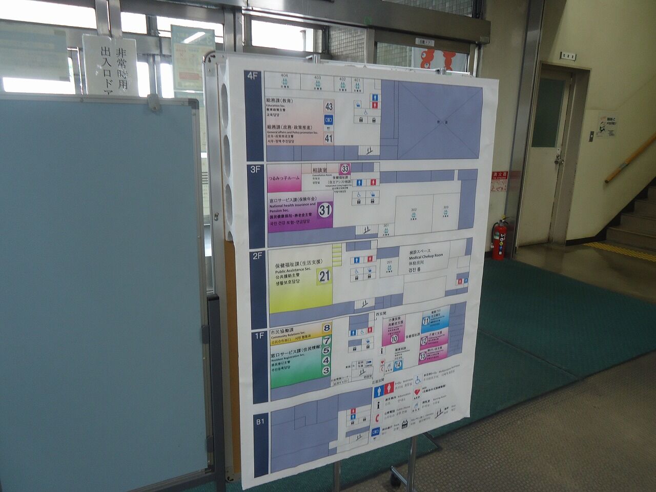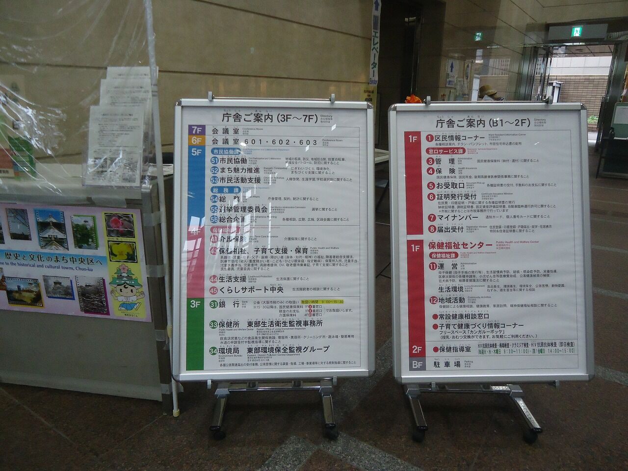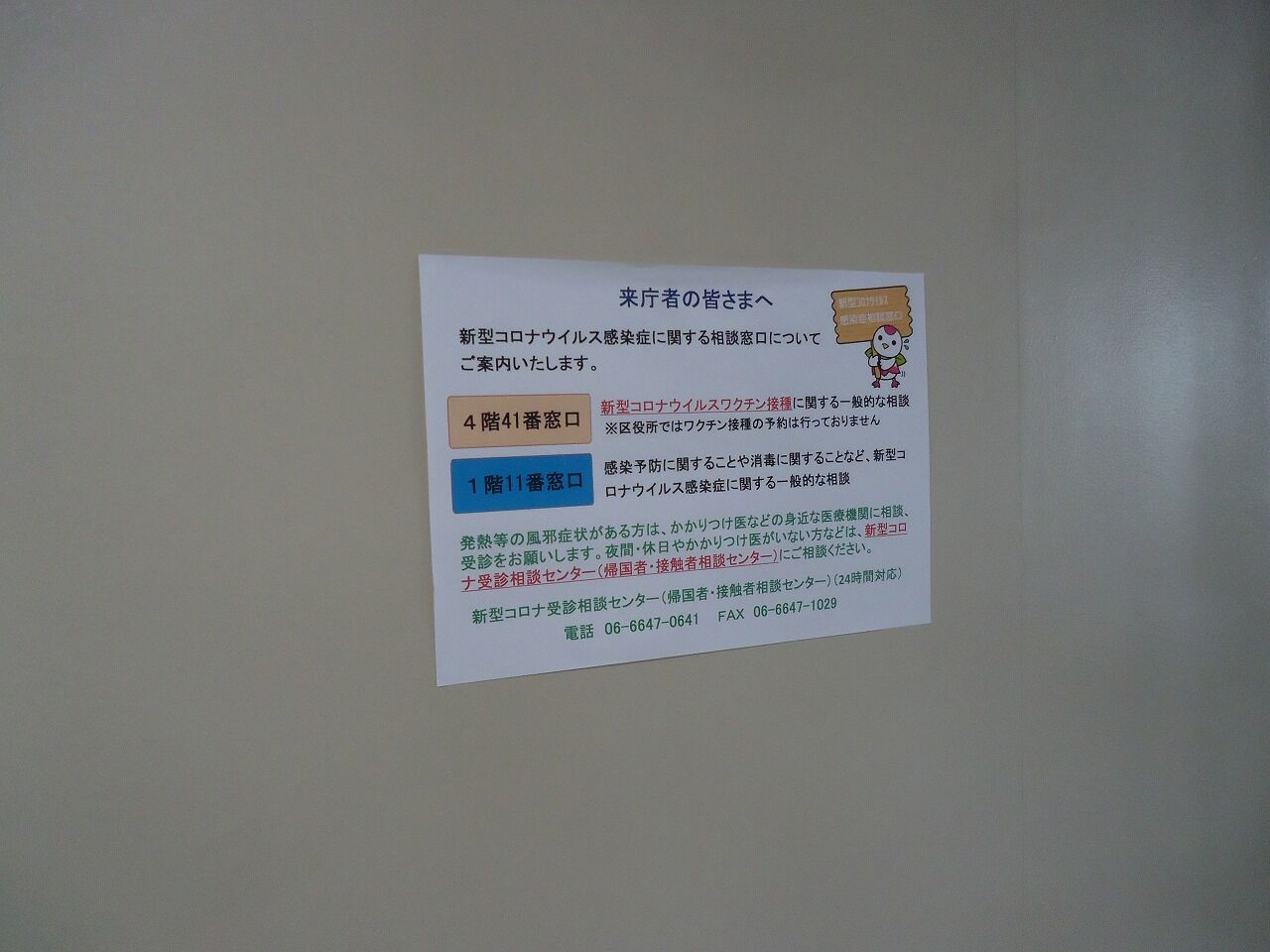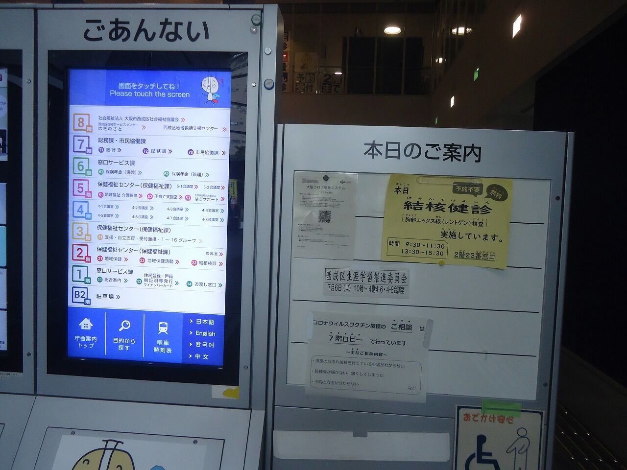 なんか年季の入った立派な建物だ…中はちょっと手狭な感じであった。総合案内で聞くと、ワクチン相談は2階の22番窓口、自立相談支援「サポート天王寺」は4階44番窓口だそうな。