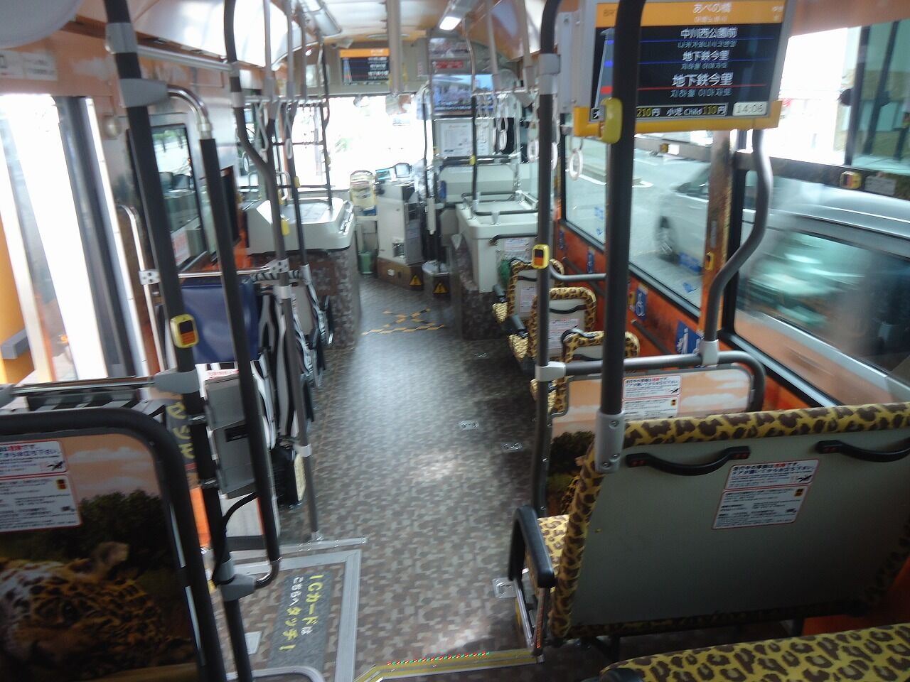 バスの中は、こんな感じ…BRTだからといって、特別なつくりになっているわけではない。バスによってそれぞれ異なるテーマ性を持った内装デザインにしており、私が乗ったヤツは椅子がヒョウ柄なので、4号車(アフリカン)ということだ。
