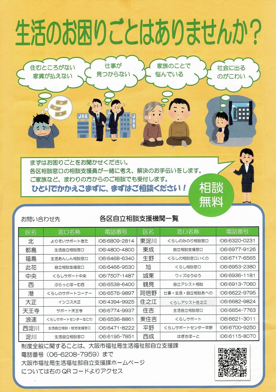 阿倍野区役所では、ワクチン相談窓口は1階の奥まったところに、自立相談支援機関「仕事・生活・自立相談あべの」は1階のわりと入り口に近いところにあった。なお生活保護担当の自立支援課窓口は3階にあって、相談室がプライバシーを守れるようになっている。