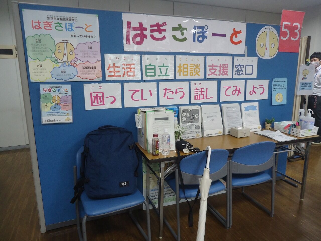 こぢんまりとしているが、なかなかきれいな庁舎である。入り口は少し変わった中二階のような構造になっており、総合窓口は2階になる。自立相談支援「くらしサポート」窓口は3階、隣のホールはワクチン接種会場だ。ワクチン相談は、1階の会議室があてられている。